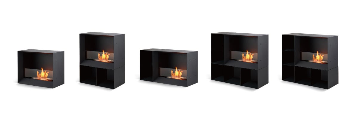 『Form(フォーム)』は、置かれる場所に合わせてモジュールを選び組み合わせることができるユニット暖炉です。横長の小型バーナー(XS340)を搭載した暖炉本体部分を最小単位として、下段・左右に高さ違いのモジュールを組み合わせることで、5種類8パターンの暖炉ユニットが完成します。素材はスチールにブラックの粉体塗装を施しており、オレンジの炎をより美しくみせています。また、離隔距離は最小におさえているため、コンパクトに配置できるのも魅力です。