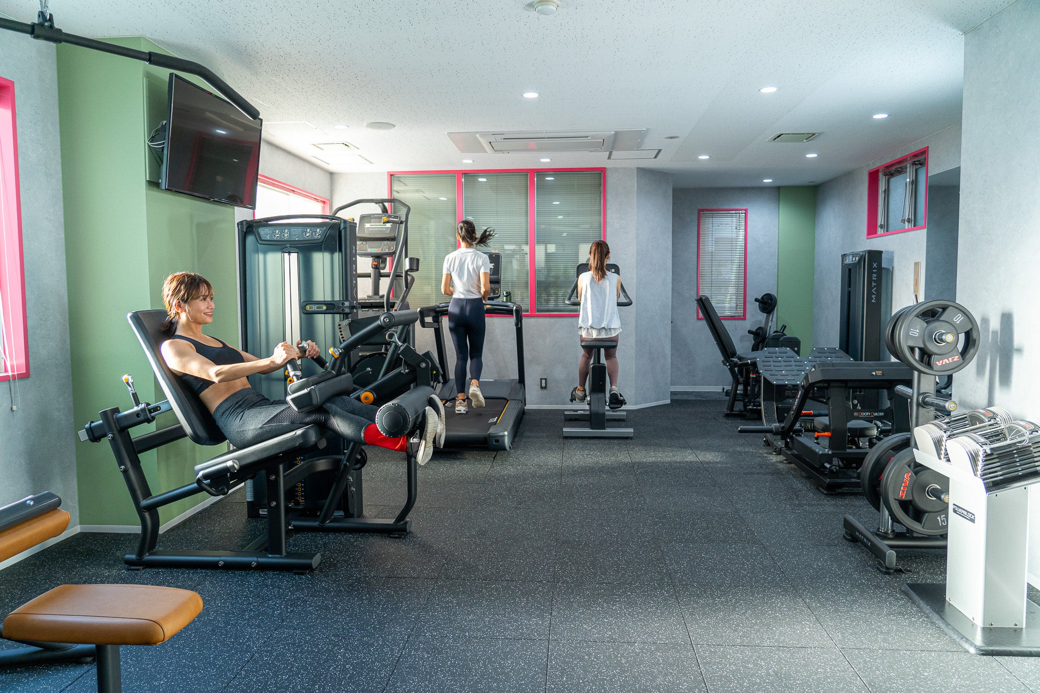 お尻や下半身を引き締めるために特化した、ブーティービルダー、アブダクターマシン、レッグカール・エクステンションマシンを導入。有酸素マシンも充実しており、ランニングマシンやバイク、ステアクライマーに加え、フリーウェイトマシンを完備。