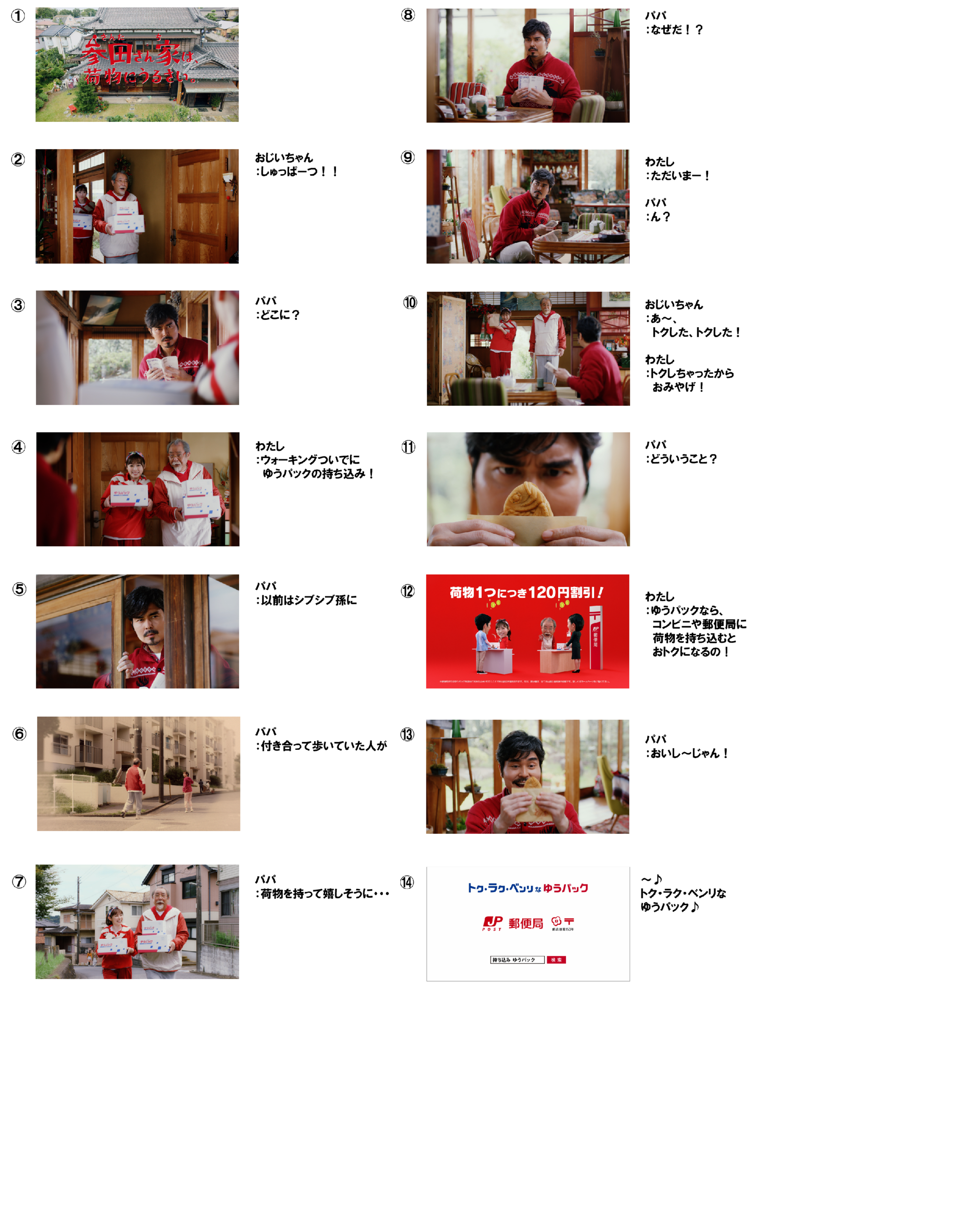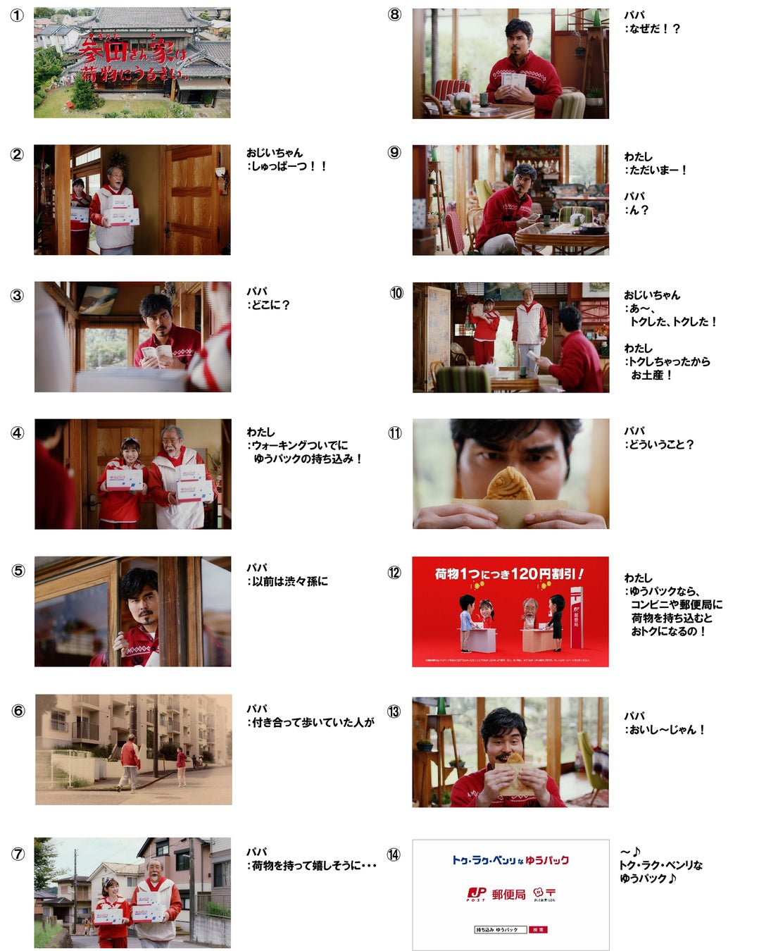 今回の新CMでは、コンビニや郵便局へ荷物を持ち込むと割引になる「ゆうパックのおトクな送り方」を、いつも仲良しな「参田家」の“オフシーズンの日常”を通して楽しく伝えています。