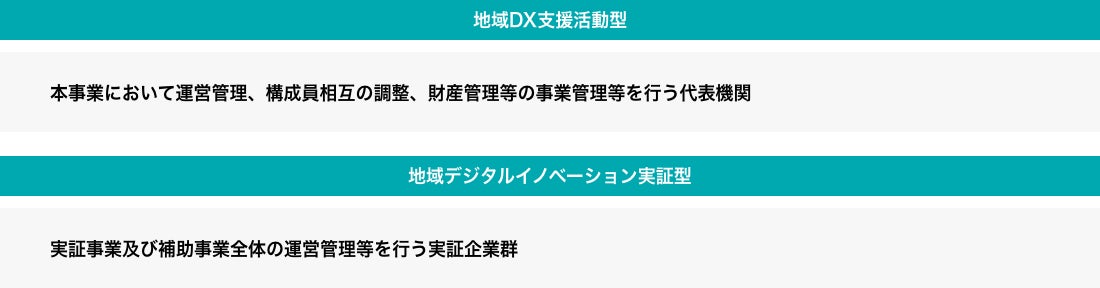 本補助金は、地域企業・産業がデジタル技術を活用した業務・ビジネスモデルの変革を実行するために、以下「地域DX支援活動型」と「地域デジタルイノベーション実証型」の2事業に要する費用を補助します。