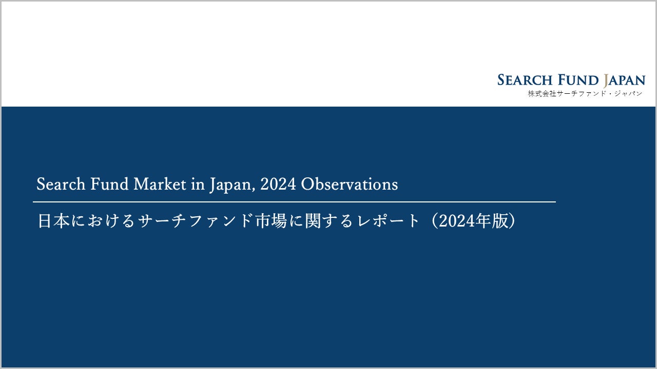 株式会社サーチファンド・ジャパン(以下、「当社」)は、日本のサーチファンドマーケットの現在地を網羅的に確認できる資料として、「Search Fund Market in Japan, 2024 Observations-日本におけるサーチファンド市場に関するレポート(2024年版)-」(以下、「本レポート」)を公開いたしました。下記リンク先ページよりPDFにて掲載しております。