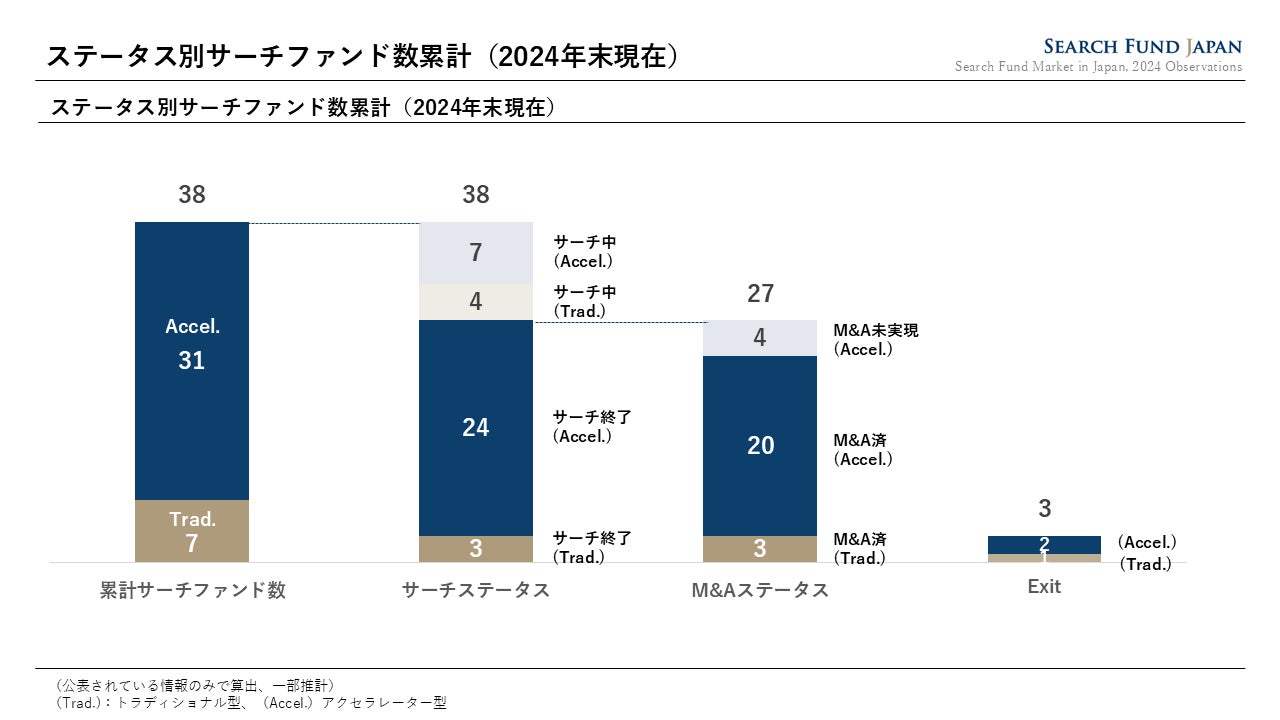 2024年末にいたるまで、日本では累計38本のサーチファンドが活動を開始。内、11本がサーチ活動中であり、27本がサーチ活動を終了している。サーチ活動を終了した27本のうち23本のM&Aが実現し、4本はM&Aが実現せずサーチ活動を終了している。