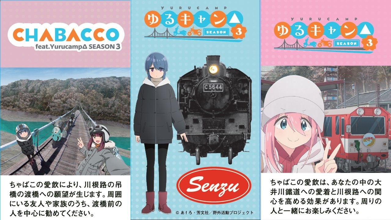 株式会社 KAWANEホールディングス(所在地:静岡県榛原郡川根本町、代表取締役:迫洋一郎)は、9月20日(金)より「Chabacco×ゆるキャン△ SEASON3 コラボパッケージ」を販売します。 パッケージは全3種類あり、「千頭駅リンver.」、「千頭駅なでしこver.」、「大井川のつり橋ver.」、各3000個の数量限定販売となります。また、ゆるキャン△コラボ限定特典として、6種類のキャラクターカードがランダムで一枚入っています。
