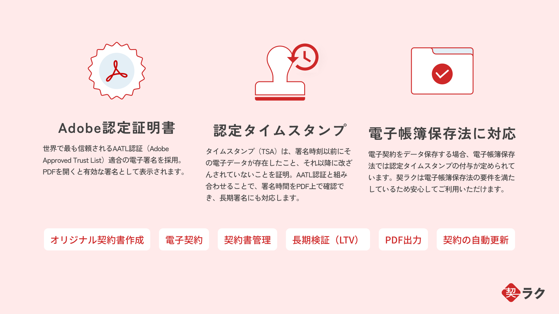 - 充実の機能で電子契約に完全対応:電子帳簿保存法に準拠。オンラインで契約から更新までをすべて完結できます。