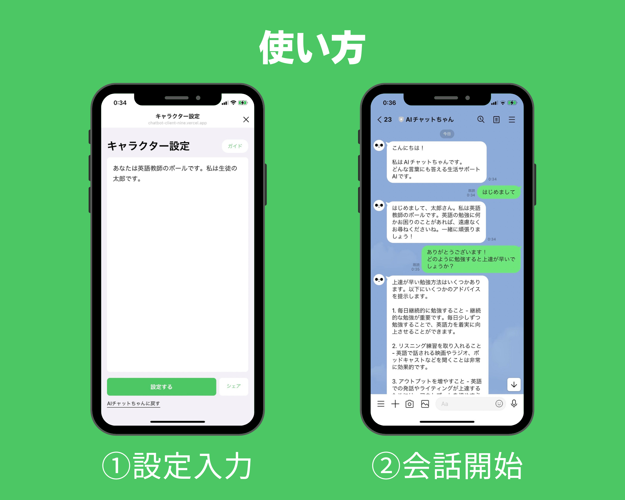 "AIチャットちゃん"に人格の設定や学習をさせることができる機能です。