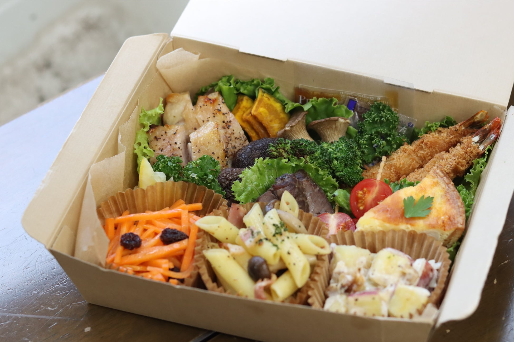 少しずつ色んなおかずを食べたい方にぴったりの、当店人気のお惣菜を集めたお弁当。パンを添えればしっかりとお腹も満たされます。またお好きなアルコールと合わせれば、立派なおつまみとしても大満足。ちょっとした外ご飯にも、もってこいの洋風行楽弁当です。