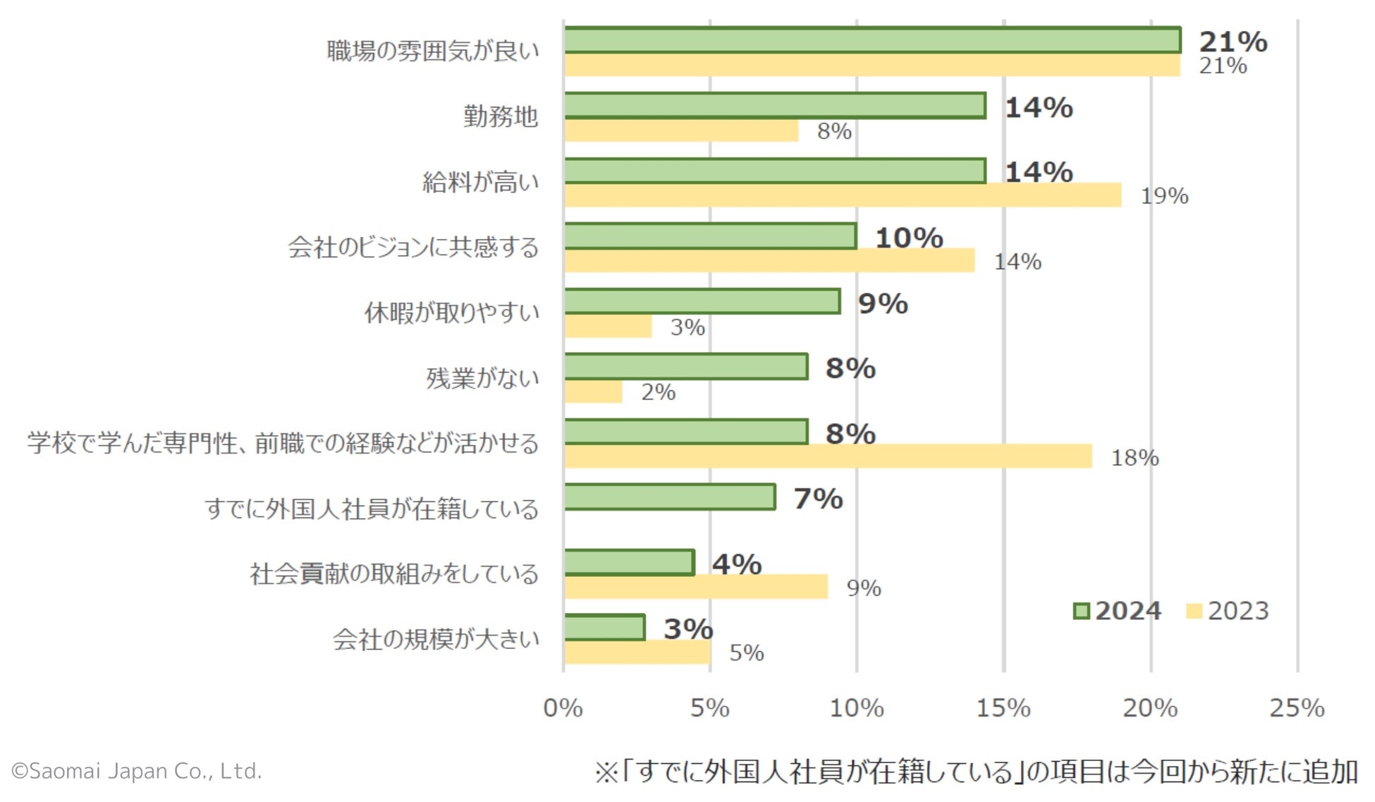 外国人人材が仕事選びで重視する点は「職場の雰囲気が良い」ことが21%で前年と同様に最多でした。次いで、「勤務地」と「給与が⾼い」が14%と続きました。