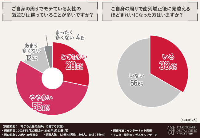 実際に、ご自身の周りでモテている女性は歯並びが整っている方が多く、歯列矯正をした方が見違えるほどきれいになったと感じた経験があることが分かりました。