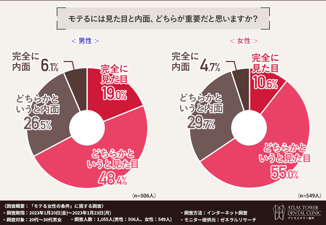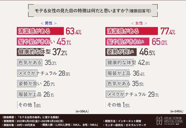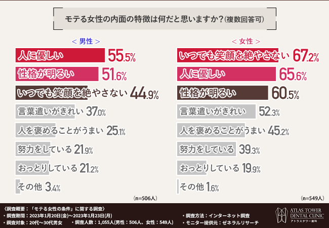 そこで今回、中目黒の歯科医院アトラスタワーデンタルクリニック(https://8wa.jp/)は、20代~30代男女を対象に、「モテる女性の条件」に関する調査を実施しました。