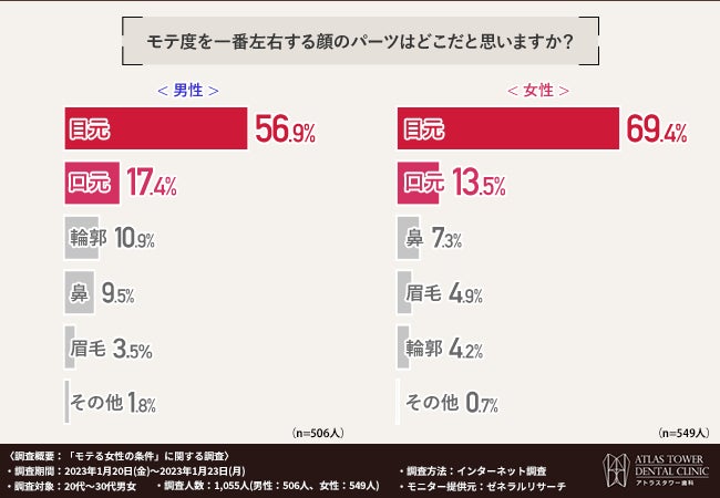 目元がモテ度を一番左右すると思う方が、男女ともに多いことが分かりました。