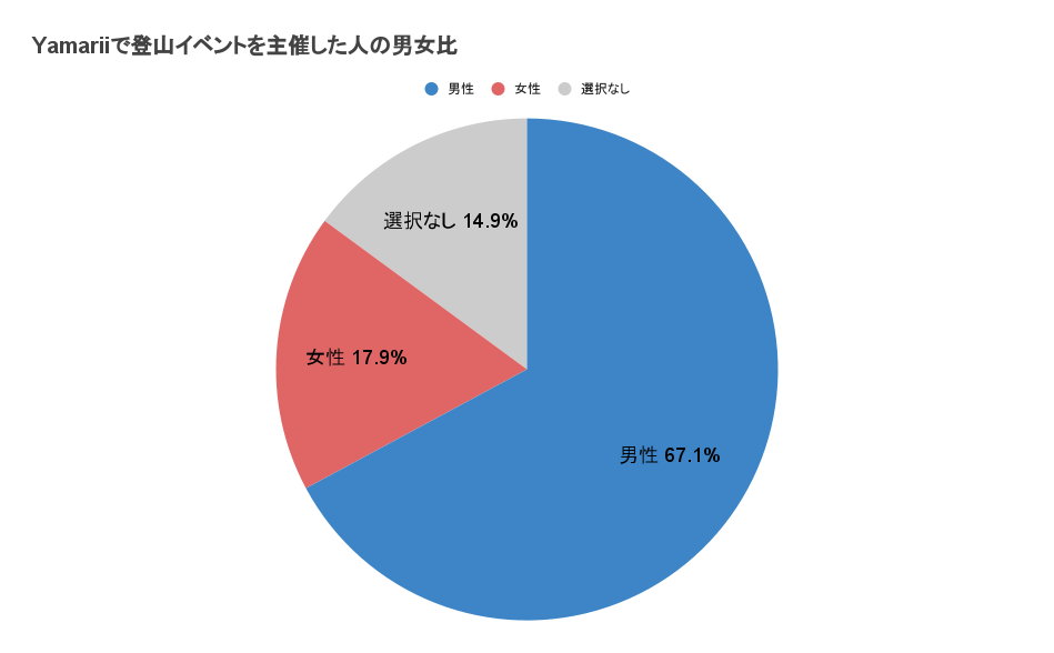Yamariiで登山イベントを主催した男女比は男性67.1%、女性17.9%、選択なし14.9%となっております。
