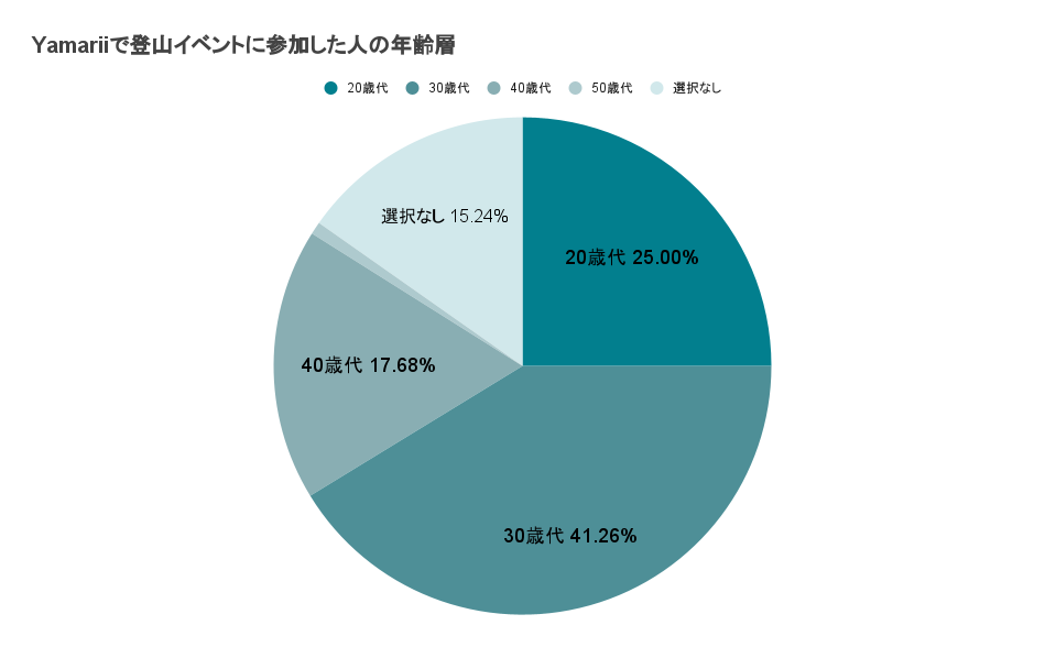 Yamariiで開催された登山イベントに参加した年齢層は、20歳代25.00%、30歳代41.26%、40歳代17.68%、50歳以上0.8%、選択なし15.24%となっております。