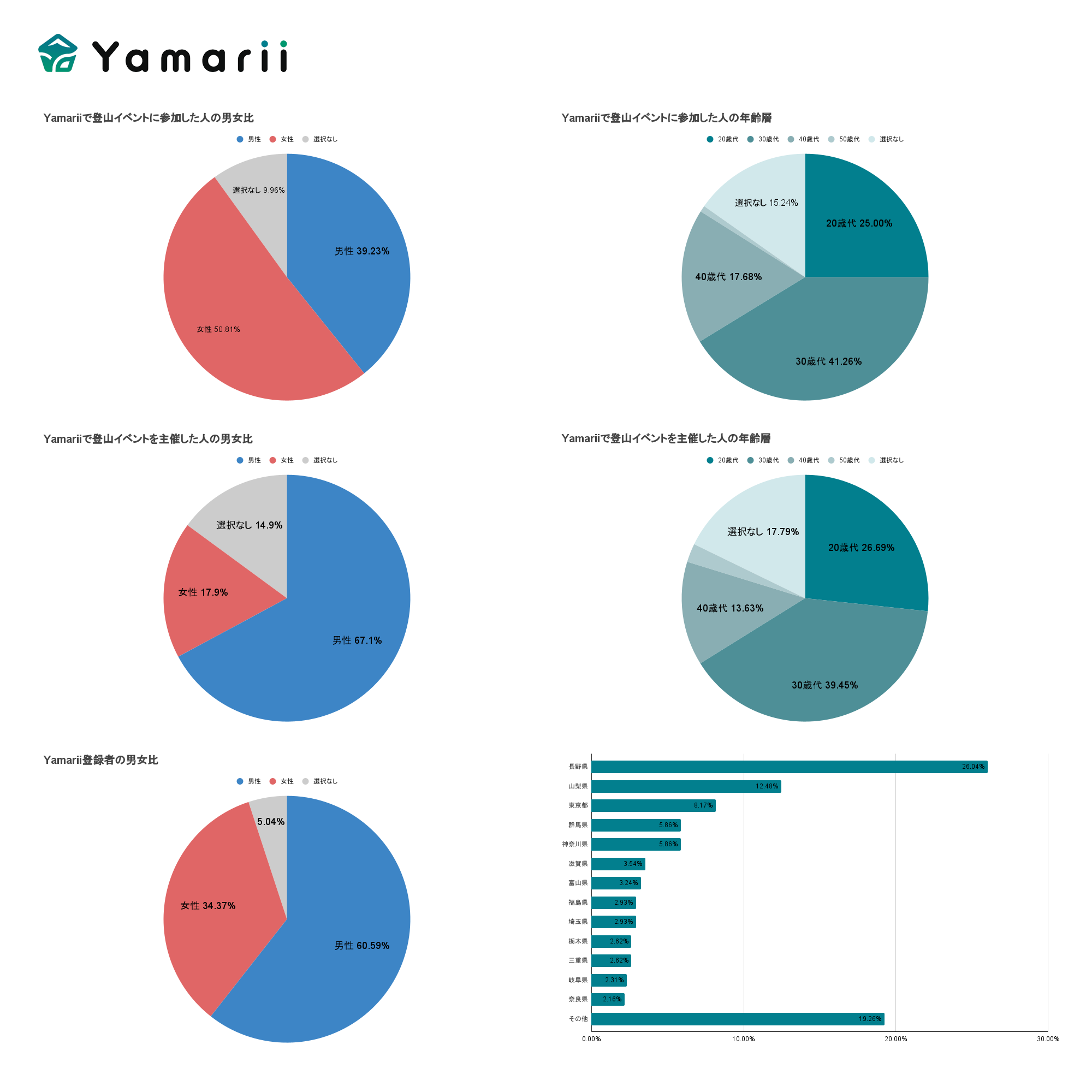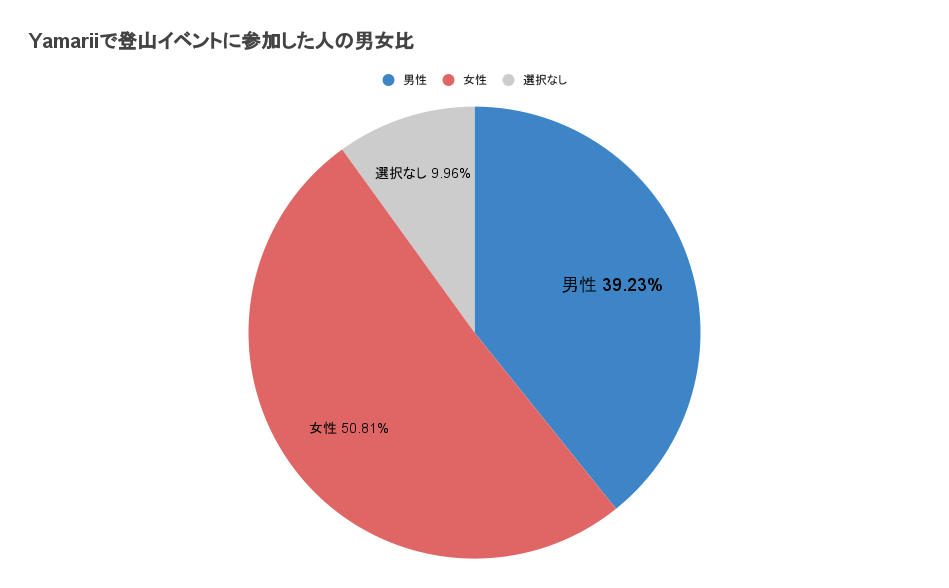 Yamariiで登山イベントが開催され、参加したユーザー層は男性39.23%、女性50.81%となっております。