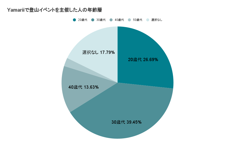 Yamariiを利用して登山イベントを主催した年齢層は、20歳代 26.69%、30歳代39.45%、40歳代13.63%、50歳以上2.44%となっております。