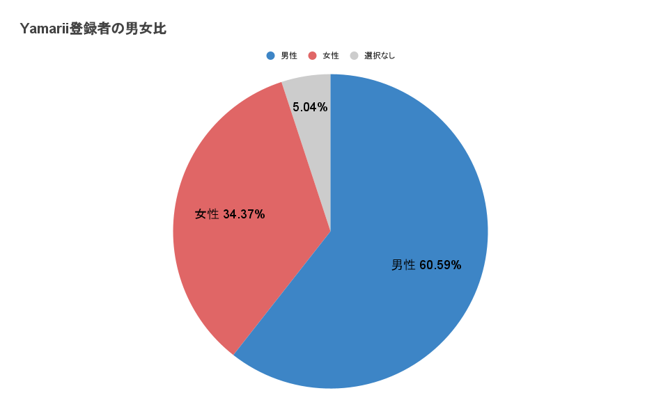 Yamariiのユーザー層は男性 60.59%、女性 34.37%、選択なし 5.04%となっております。