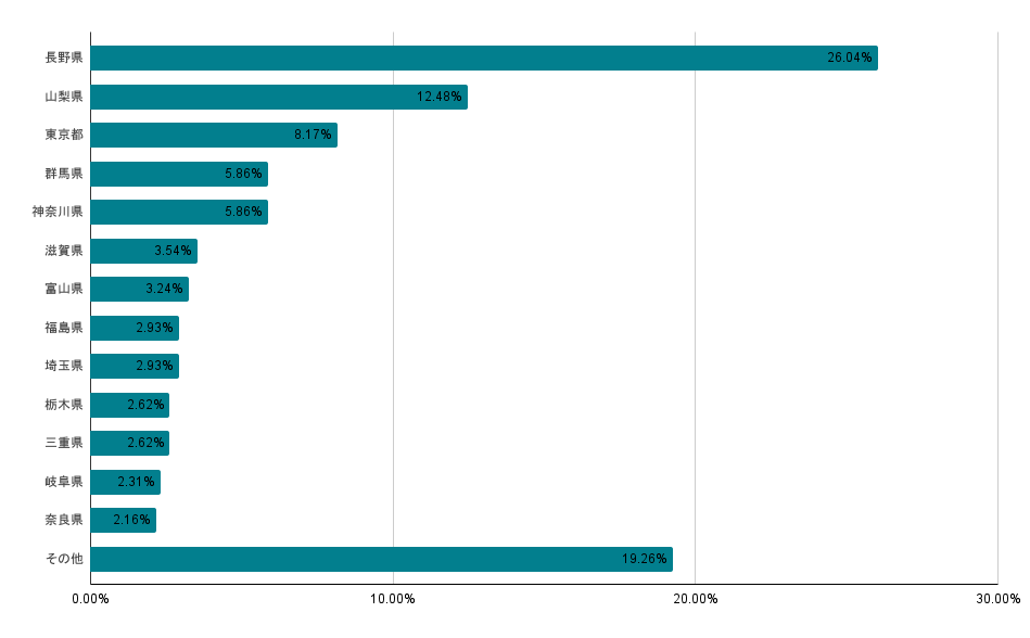 Yamariiで開催された登山イベントで募集先となった地域の分布は、長野県 26.04%、山梨県 12.48%、東京都 8.17%、群馬県 5.86%、神奈川県 5.86%、滋賀県 3.54%、富山県 3.24%、その他都道府県19.26%となります。
