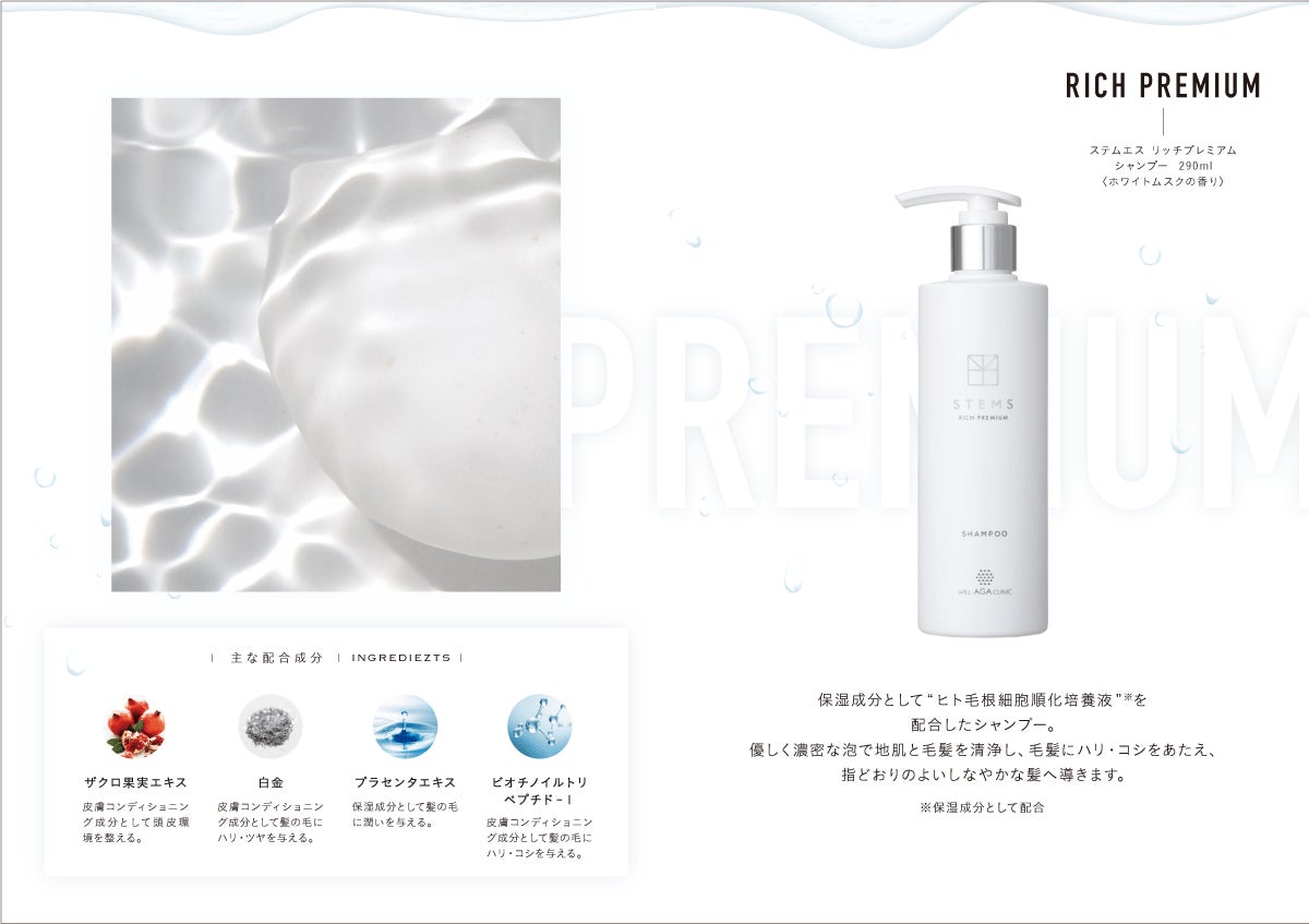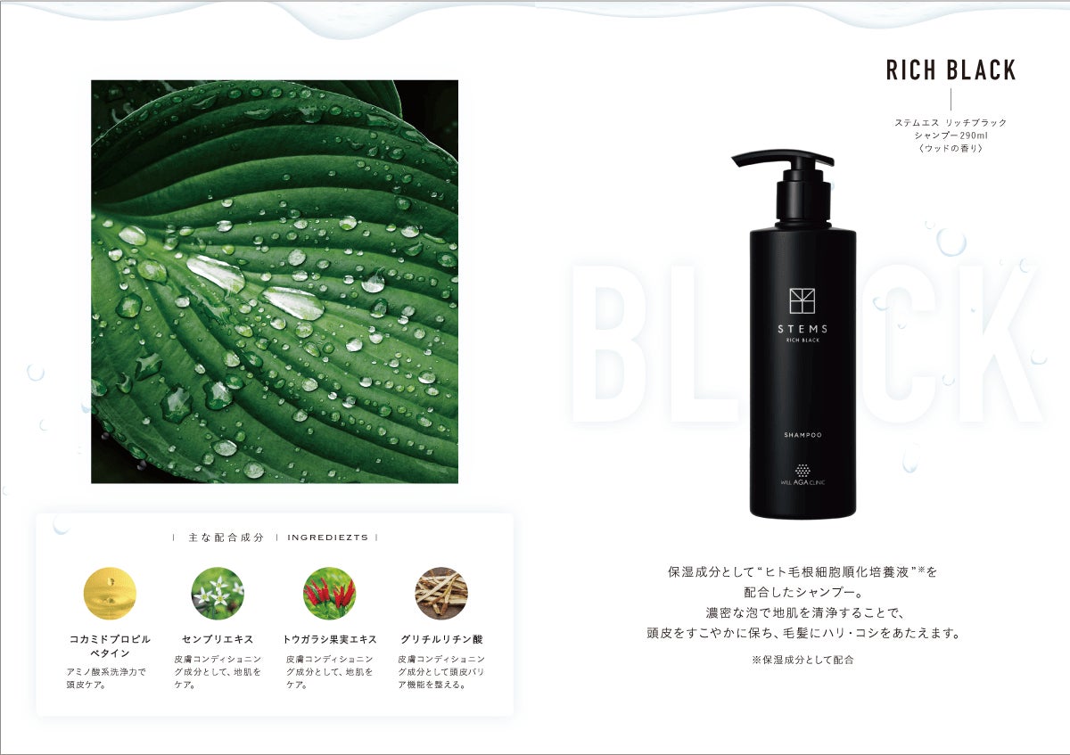リッチブラック シャンプー、リッチプレミアム シャンプー、リッチケア トリートメントの3タイプからなるシャンプー・トリートメントといったラインアップで、『STEMS』ブランドを展開してまいります。