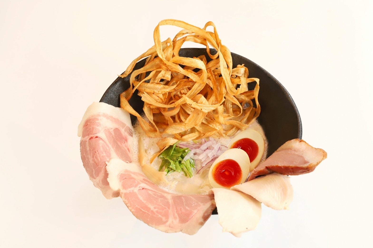 2020年から4年連続で《食べログ百名店》に選出される、関西の人気店が関東2店舗目出店。鹿児島県産桜島鶏のみで12時間丁寧に仕込む濃厚白湯スープは、雑身が無く旨み溢れる自信作です。さらに、提供直前に、厳選した九州産の煮干しを使用した煮干しスープと鶏脂を加えることで深みと香りが溢れる逸品に仕上がり、まるでポタージュのようなクリーミーな口当たりを演出しています。見た目も鮮やかな揚げゴボウの食感と、こだわり抜いた自家製麺を一緒にご堪能あれ!