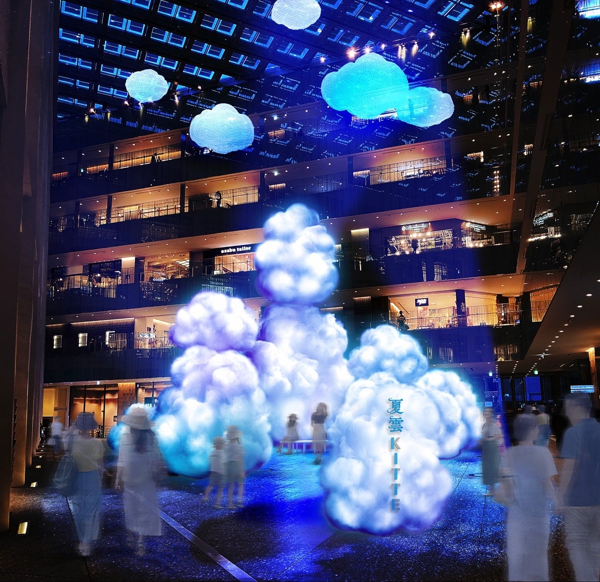 1階アトリウムに、巨大な入道雲が出現。大小様々な雲が上空にも広がる事で開放感のある空間を演出しています。それらの雲に音と光の効果を施し、5つの変化をお楽しみいただけます。時間と共に変わった表情をみせる「夏雲」をKITTEで堪能してみませんか。