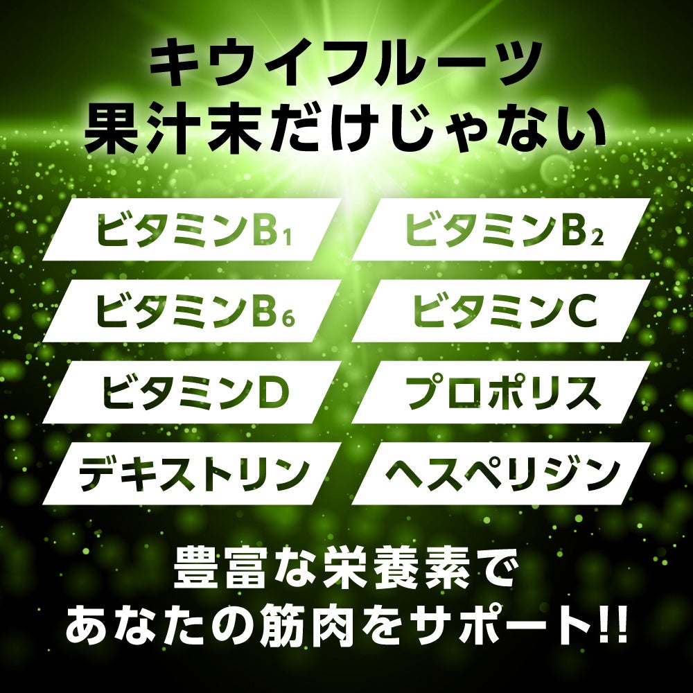 本来であれば、実証データの取れているキウイフルーツ果汁末だけをサプリメントにして発売すればいいわけですが、より効果を実感していただけるように、たんぱく質の吸収を促進してくれると言われているビタミン群やデキストリンなどの豊富な栄養素で筋肉をサポートします!!