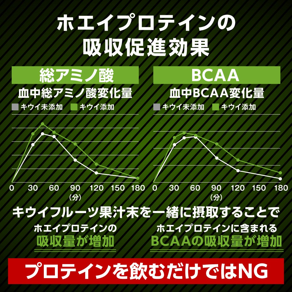 キウイフルーツ果汁末を一緒に摂取することで、ホエイプロテインの吸収量、ホエイプロテインに含まれるBCAAの吸収量が増加しました。