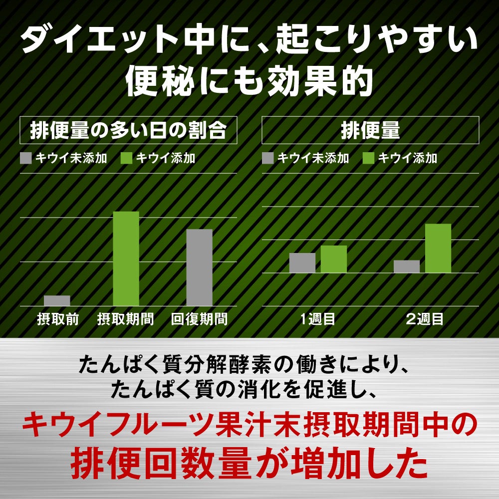 プロテインを過剰摂取することで、消化不良が起こり、便秘になりやすいため、キウイフルーツ果汁末を摂取した時と、摂取してない時、またその後も含めて、排便量に違いが出るか?を実験したデータです(参照②)