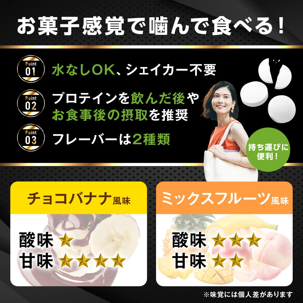また、昨今のサプリメントは、水で飲む錠剤タイプばかりで、トレーニー(筋トレする人の名称)たちも飽き飽きしてると思い、ラムネみたいに噛んで食べられるタブレットタイプにしました。