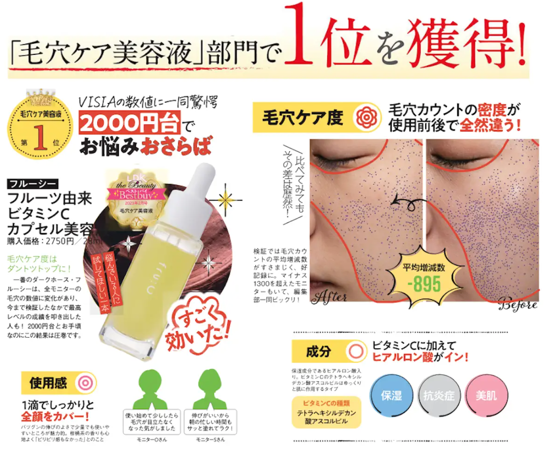 タイアップなしの本音でコスメを批評をする人気の女性誌、LDK the Beauty 2023年2月発売〈毛穴ゼロ肌 完全コントロール〉特集にて、『fru:C(フルーシー)』が美容液部門で1位を獲得!
