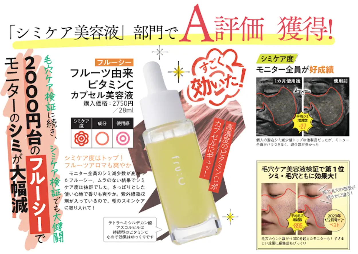 さらに、2023年5月発売〈老けない肌の新正解見つけた!シミ防御編〉特集にて、『fru:C』が「すごく効いた!」とA評価を獲得!モニター全員の潜在シミ減少数が高い結果となりました。