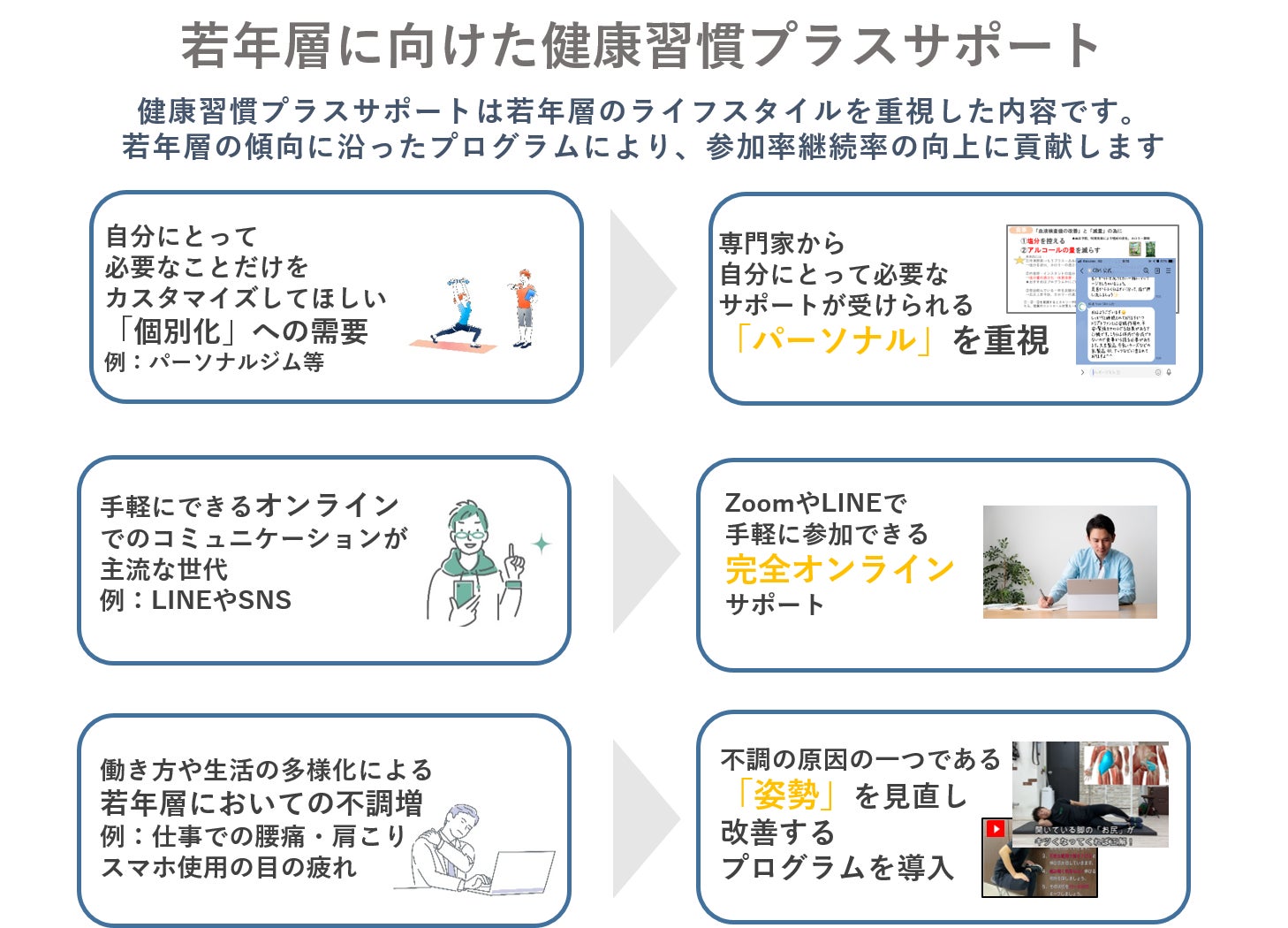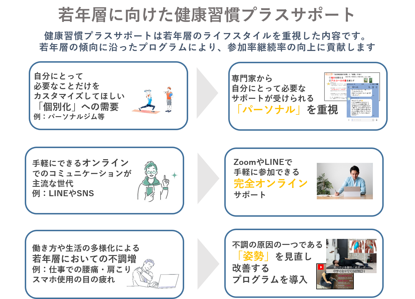 「健康」へのハードルを下げた、日常の延長線でできる食事と姿勢の改善により自発的な健康行動の意識付けを行い、将来的な特定保健指導への新規流入防止、メタボリックシンドローム予防に努めます。