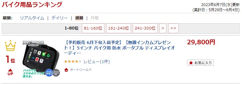 「楽天スーパーSALE-全ショップ対象ポイント最大44倍-(2023/06/04(日) 20:00~2023/06/11(日) 01:59)」開催中の楽天市場で弊社販売のバイク用ディスプレイオーディオ(PDA-05B) https://prtimes.jp/main/html/rd/p/000000007.000068824.html が、バイク用品(対象商品:10,862,055件)部門における週間ランキング(2023年6月7日(水)更新分 https://ranking.rakuten.co.jp/weekly/200305/ )の栄えある第1位を獲得することができました!これもお客様のご支持のおかげでございます。