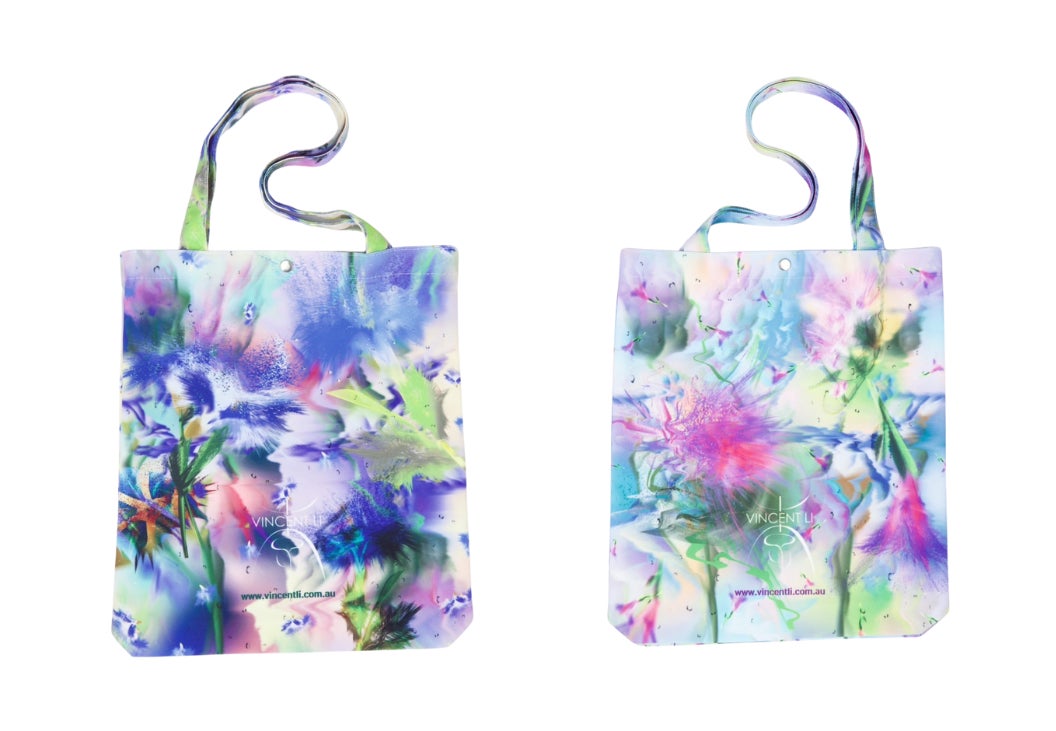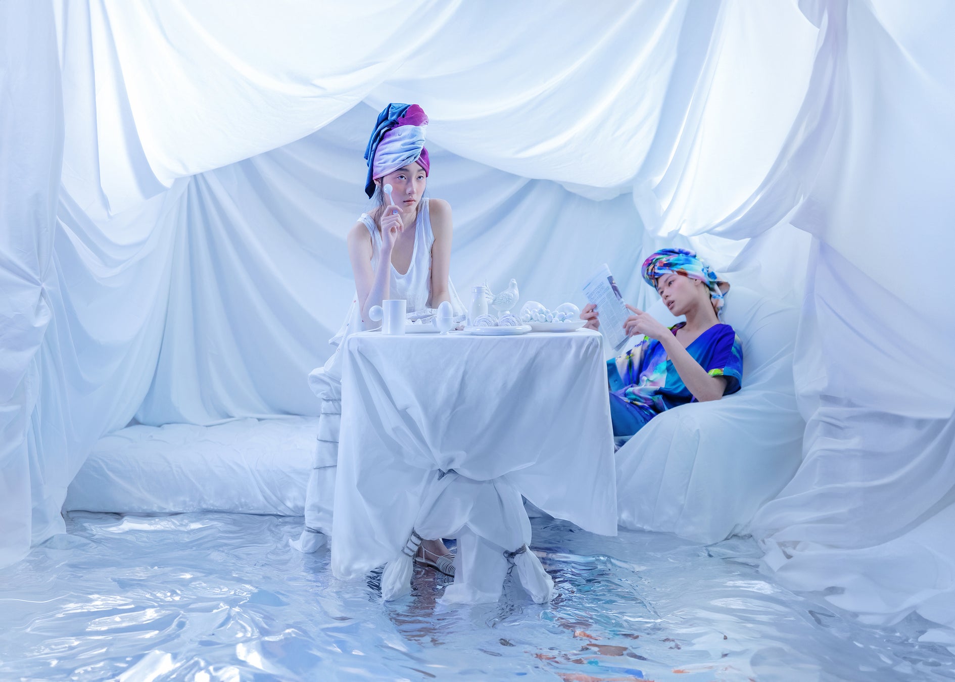 精巧なデジタルプリントで、形、色彩、モチーフを限界まで表現しました。空と湖をキャンバスにしたて、その上に花びらや葉を繊細に切り分け、巧みに配置することで、動きのある幻想的なイメージを生み出します。