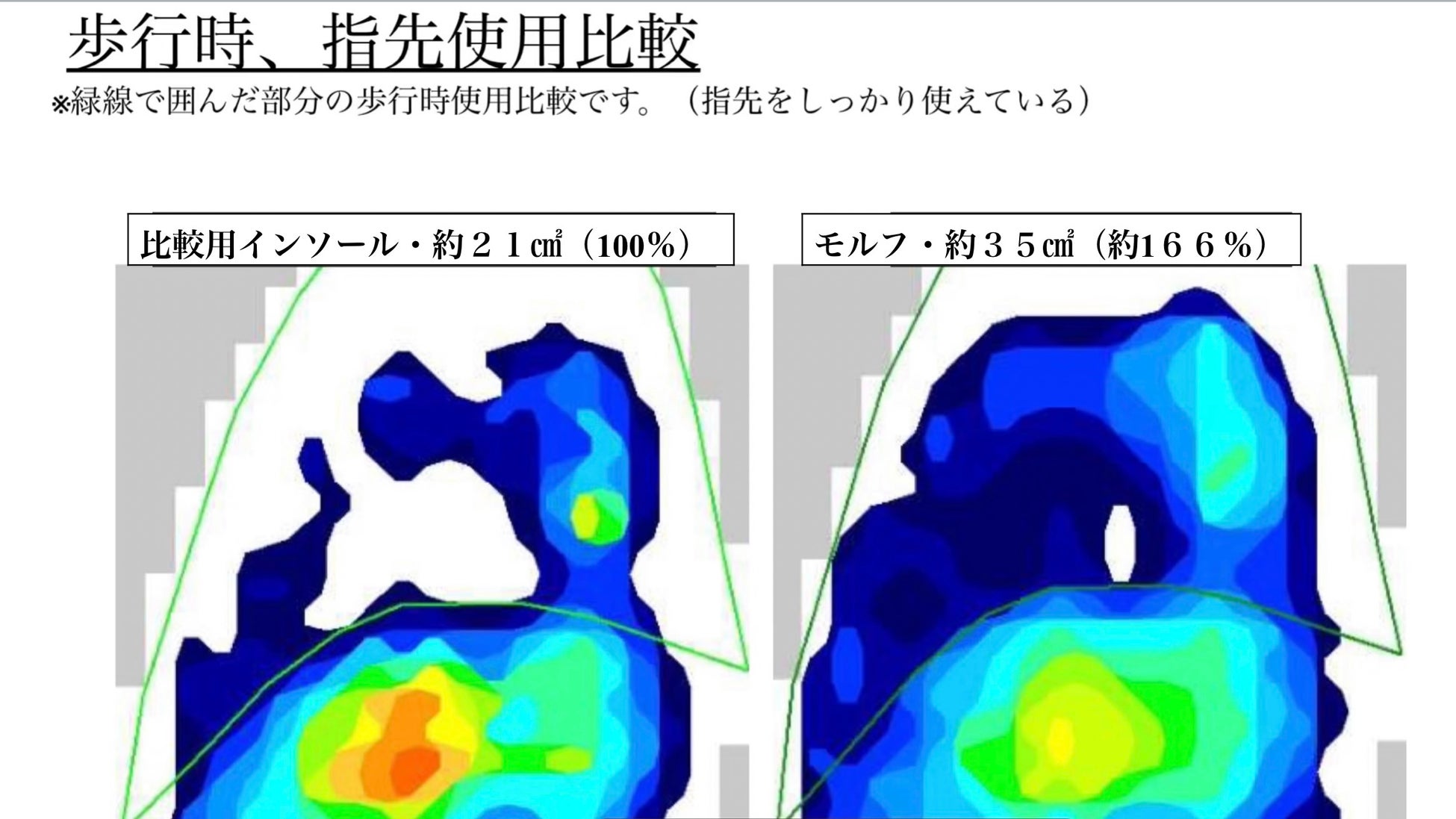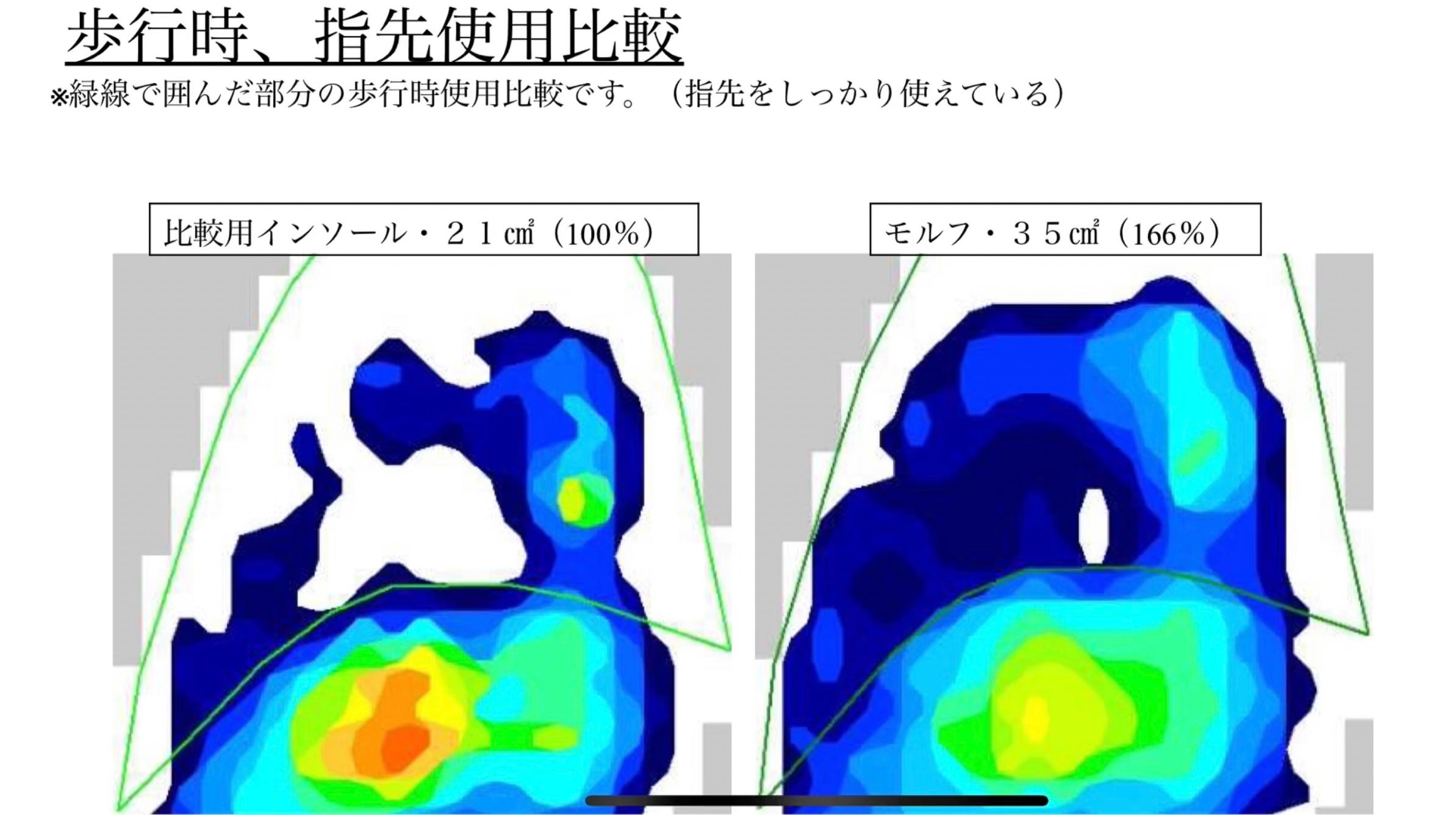つま先から踵まで足型に添う事で、足圧分散に優れ、また、足指の付け根に足の枕のような「足指レスト」が成形される。足指レストに指が引っかかる事で足の余計な滑りを抑え、さらに、指先をしっかり使って歩く事が可能となります。