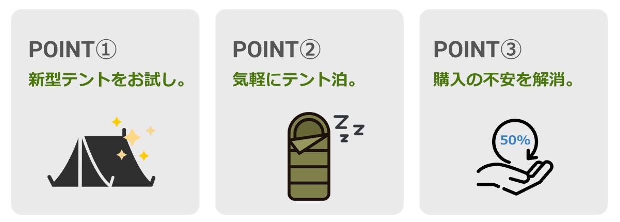 ・レンタル料金の50%を、同型テントの購入金額に充当できます(レンタル終了後2か月以内に公式サイトでご購入の場合)。