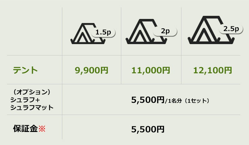 テントは1張 1.5p 9,900円, 2p 11,000円, 2.5p 12,100円 、オプションは1セット5,500円です(すべて税込)。レンタル料金の50%は、同バージョンのテントを公式サイトからご購入の場合、購入金額に充当できます。(レンタル終了後2か月以内、同バージョンであればレンタルしたテントのサイズと購入テントのサイズが異なっても対象です)