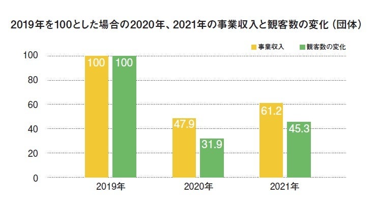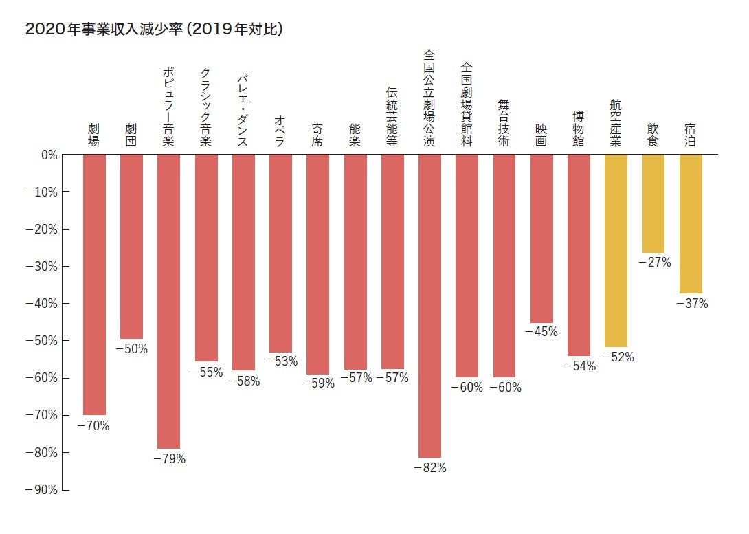 舞台芸術・ライブエンタメ業界は、コロナ禍により2020年度は対2019年比で事業収入が50~80%も落ち込む状況でした(※3)。2021年度も、事業収入は50~60%前後の回復、観客数は45%程度しか回復しておらず(※4)、客足の冷え込みが続く状況です。