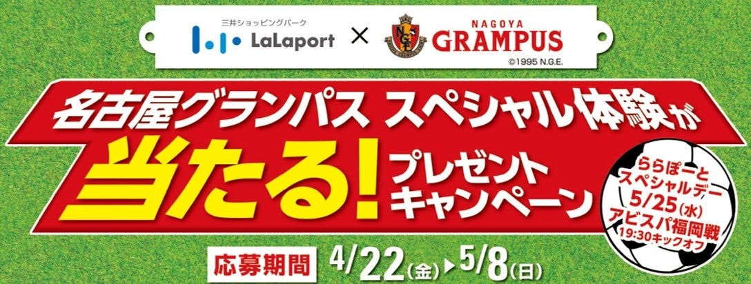 三井ショッピングパークポイントの付与を伴う3,000円(税込・合算可)以上のご利用のうえ、専用応募フォームよりエントリーいただくと抽選で、豊田スタジアムで行われる名古屋グランパス試合の、試合前セレモニーへの参加や試合直前の練習見学などのスペシャル体験をプレゼント!