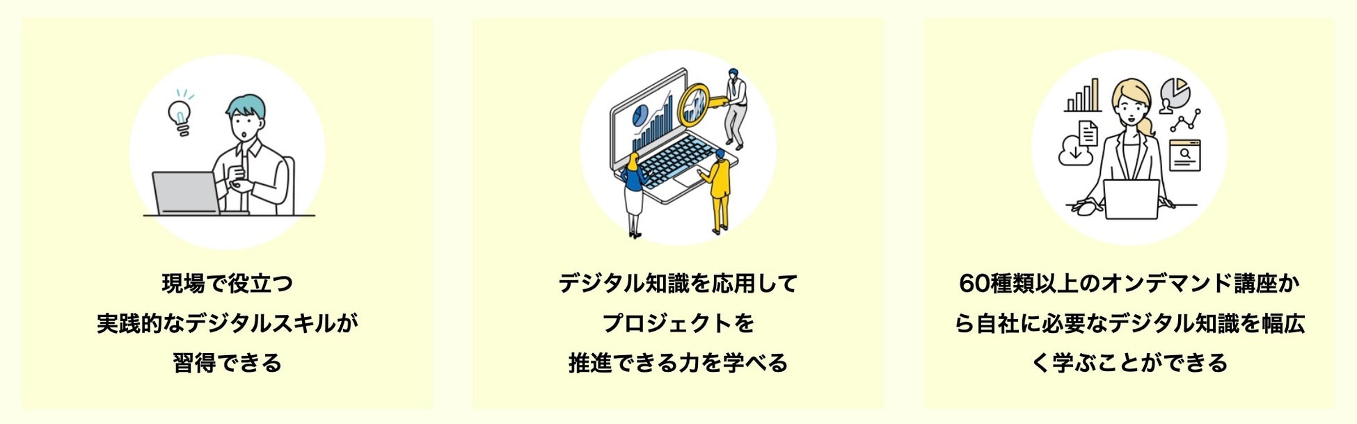 60種類以上のオンデマンド講座から自社に必要なデジタル知識を幅広く学ぶことができます