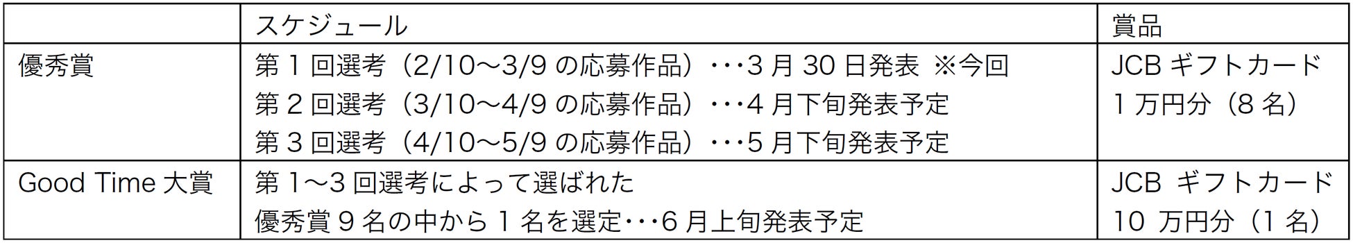 当コンテストは、6月5日の「ろうご(老後)の日」に向けて、「あなたのGood Time!」をテーマに、シニアの皆さまとの思い出や、かけがえのない日常を収めた写真を募集するものです。第1~3回選考にて選定・発表する「優秀賞」(合計9作品)の中から「Good Time大賞」として1作品を選定し、6月上旬に発表いたします。