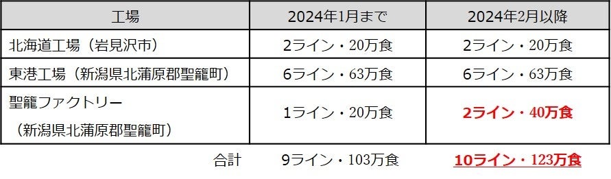 これにより、聖籠ファクトリーの生産ラインは現在の1ラインから2ラインに増加し、当社の米飯ライン数は9ラインから10ライン体制となり、「サトウのごはん」の生産能力は、現在の日産約103万食から123 万食へ大幅に伸長いたします。(年間では4億食体制)