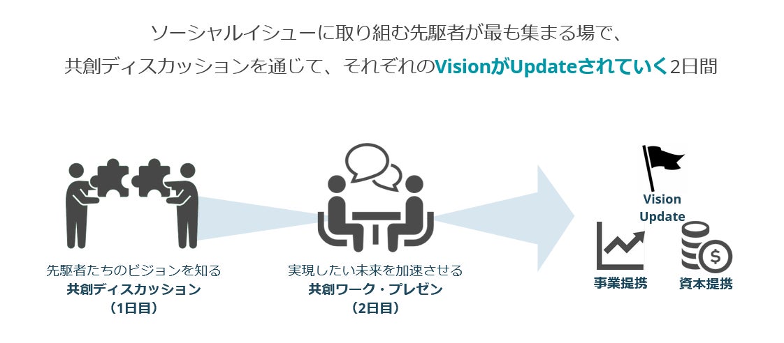 ソーシャルイシューに取り組む多種多様な業界の人たちが集まり、共創ディスカッションというお互いの対話を通じて、自身のビジョンの解像度を高め、アップデートするきっかけを提供します。