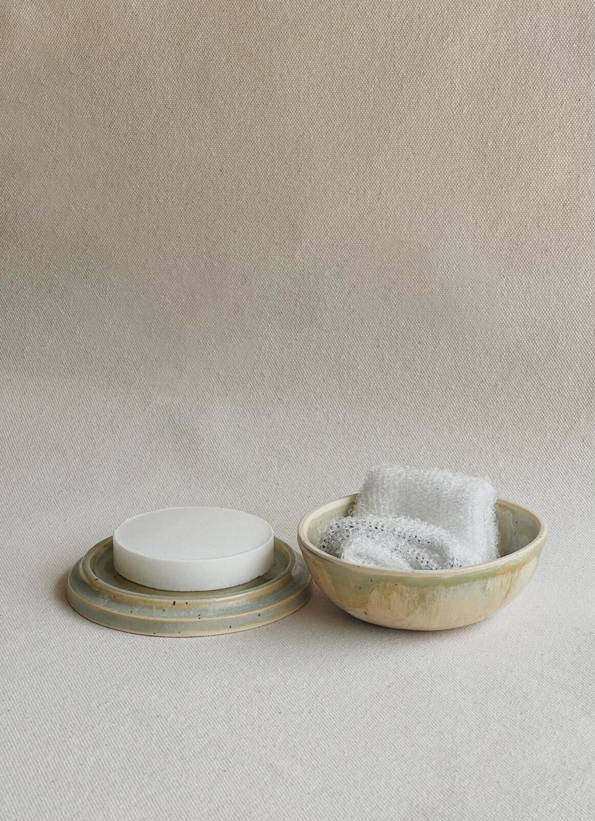嵐で倒れ、道端に廃棄された木を原料に手作業でユニークな彫刻品を生み出す奄美大島在住の木工職人、今田智幸氏による「woodworks CUE」のインセンスホルダー(お香立て)や、LAを拠点に置く建築デザイン会社「OWIU Design」の共同創始者、Amanda Gunawan氏とJoel Wong氏らによるセラミックブランド「OWIU GOODS」によるソープディッシュが並びます。