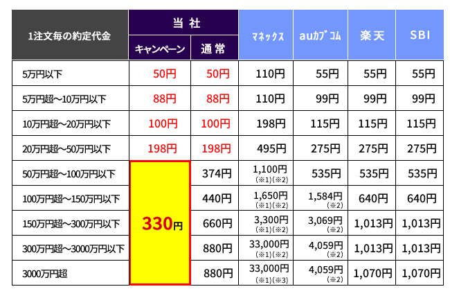 (※3) マネックス証券は上限金額の設定が無い為、約定代金3,000万円で計算した際の手数料を表示
