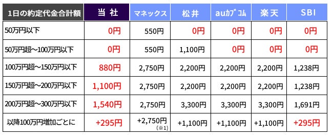 (※2)100万円超のauカブコム、マネックス手数料は、約定代金×料率で算出される為、各約定代金範囲の上限金額手数料を表示