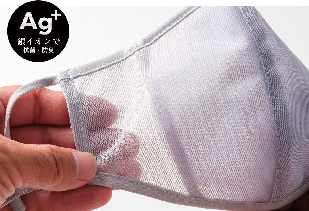 マスク全体に風通しのいい銀イオン制菌メッシュ生地を使用しています。常に微量の銀イオンを放出。銀イオンの優れた抗菌効果が、繊維上の細菌の増殖を抑制します。優れた制菌性・抗菌防臭効果(注1)を備えています。また汚れも目立ちにくく、汗をかいても乾きやすいので夏場・スポーツシーンに最適です。洗えるマスクは洗濯も可能で繰り返しご利用が可能です。メッシュ素材の特性上洗濯後もすぐに乾きます。