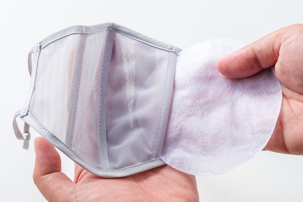 マウスフィルターは取り外し交換が可能なので、いつでも清潔な状態を保てます。フィルター自体は三層構造。表面は柔らかなふんわりとした素材。水分染み込みをへらすために撥水性をもったフィルターとなっています。呼吸のしやすさと飛沫防止のバランスを考えた作りとなっています。