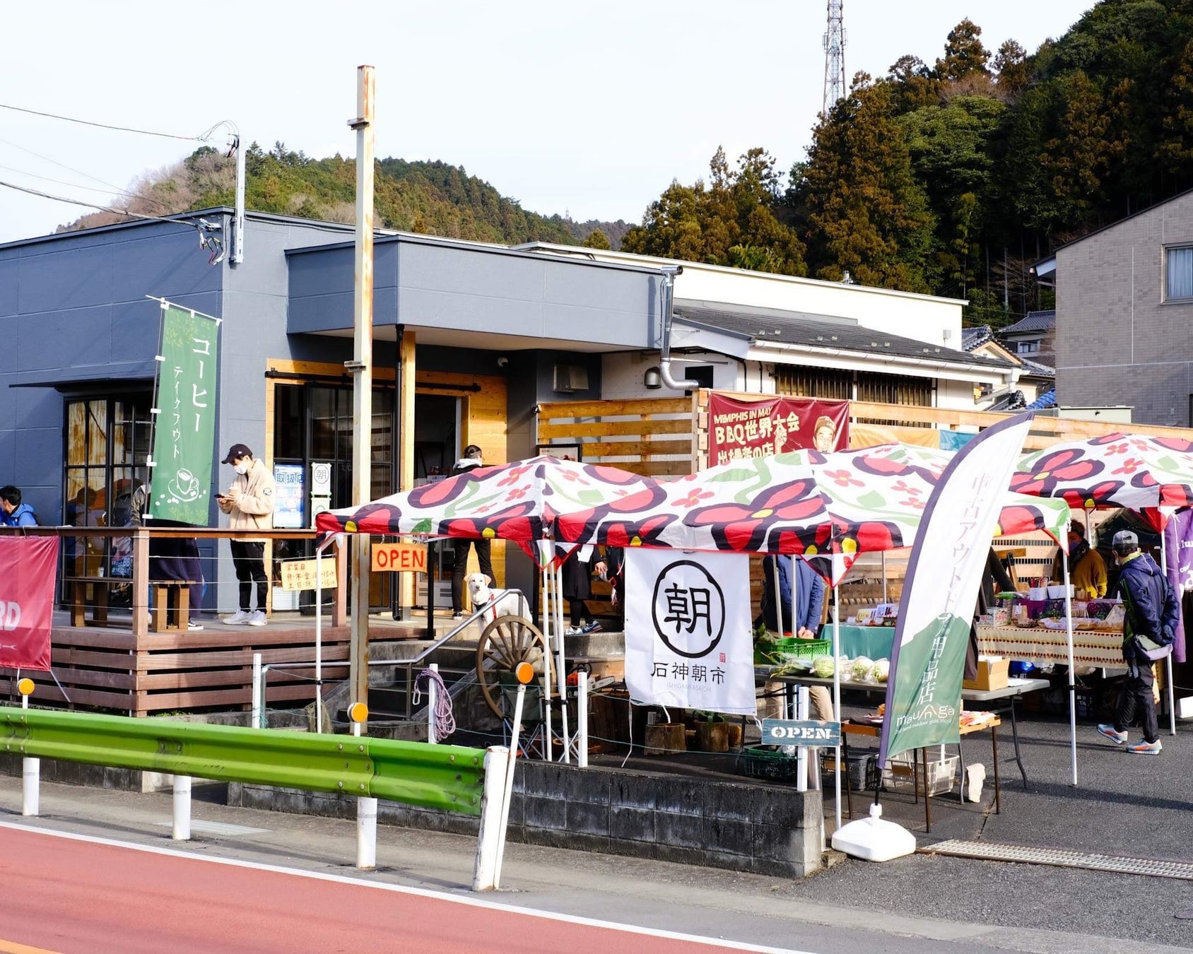 石神朝市は、地域に暮らす人が作った食材や作品が並ぶ地域の朝市。野菜や美術作品、お菓子、薪などさまざまな品に出会えるほか、地域の人と触れあい、交流し、関係やつながりが広がる場としても知られています。