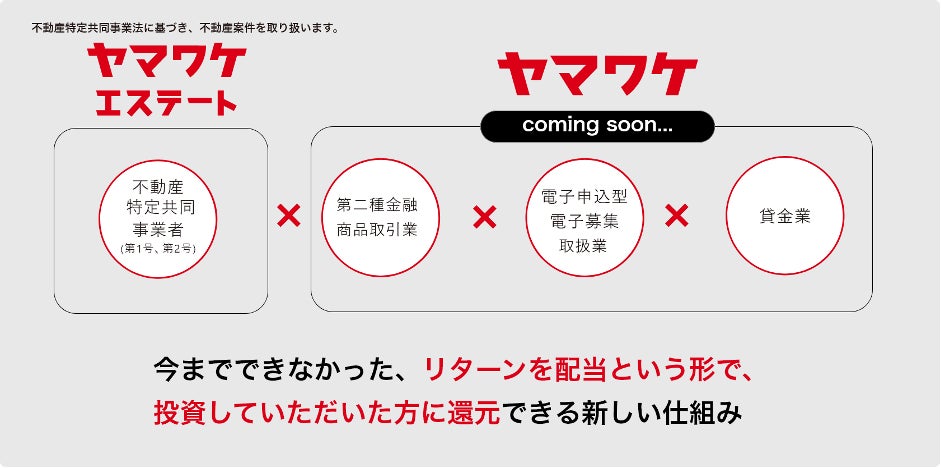 ※WeCapital株式会社が運営する「ヤマワケ」及びヤマワケエステート株式会社が運営する「ヤマワケエステート」が取り扱う商品は、元本が保証されているものではなく、投資対象となる匿名組合財産の価値の低下等により、お客様が出資した元本の損失が生じる可能性があります。各商品に係る手数料並びにリスク等の内容や性質は投資対象の商品毎に異なりますので、投資の判断はご自身で行うようお願いいたします。