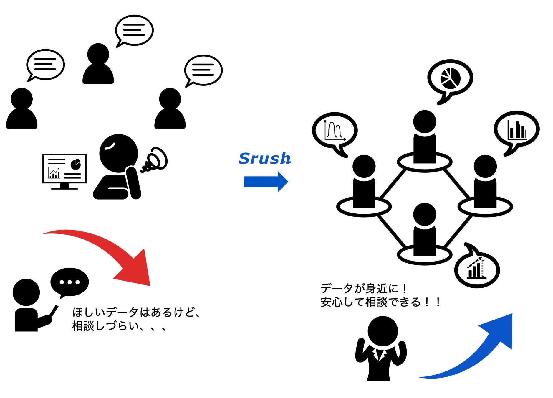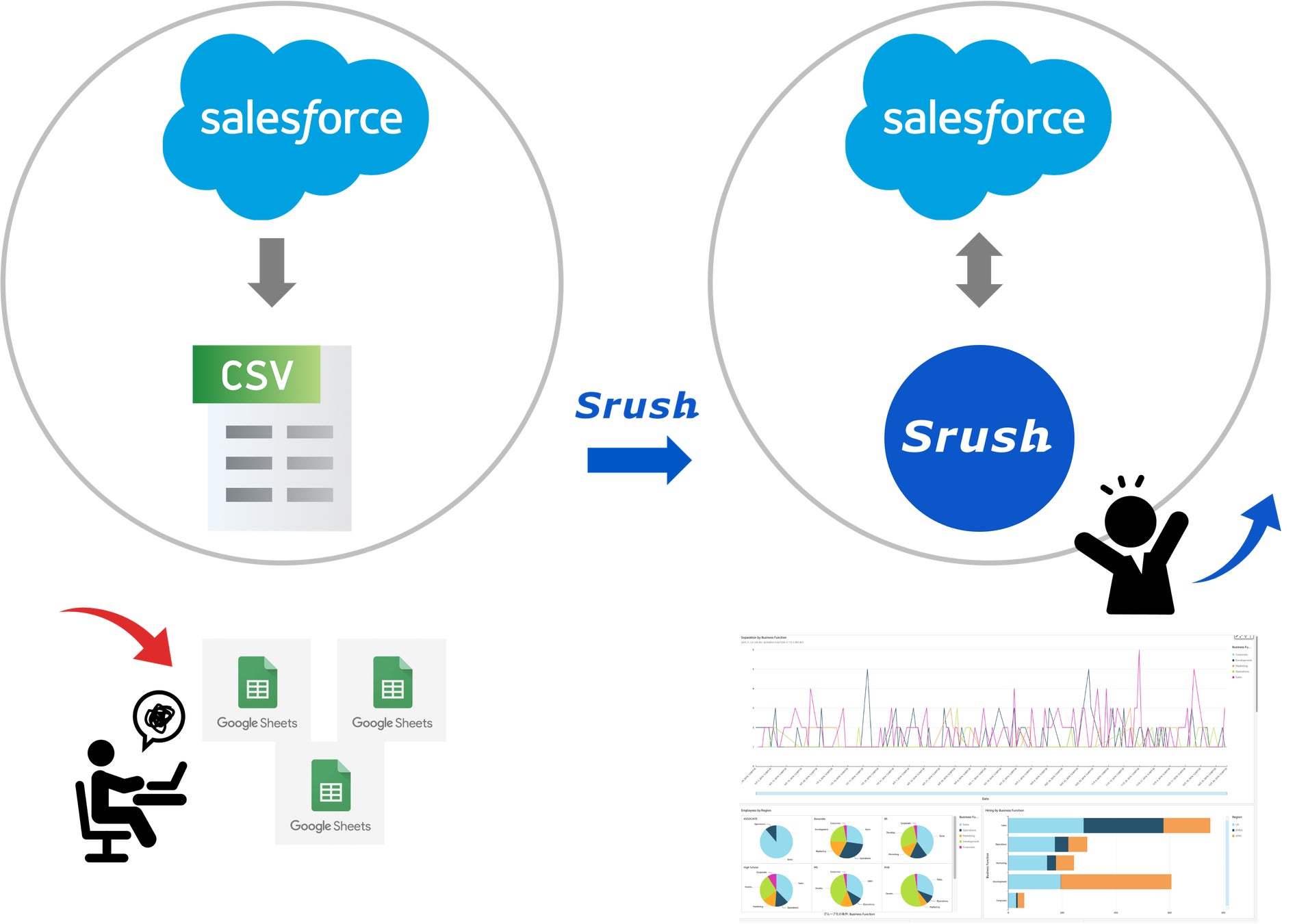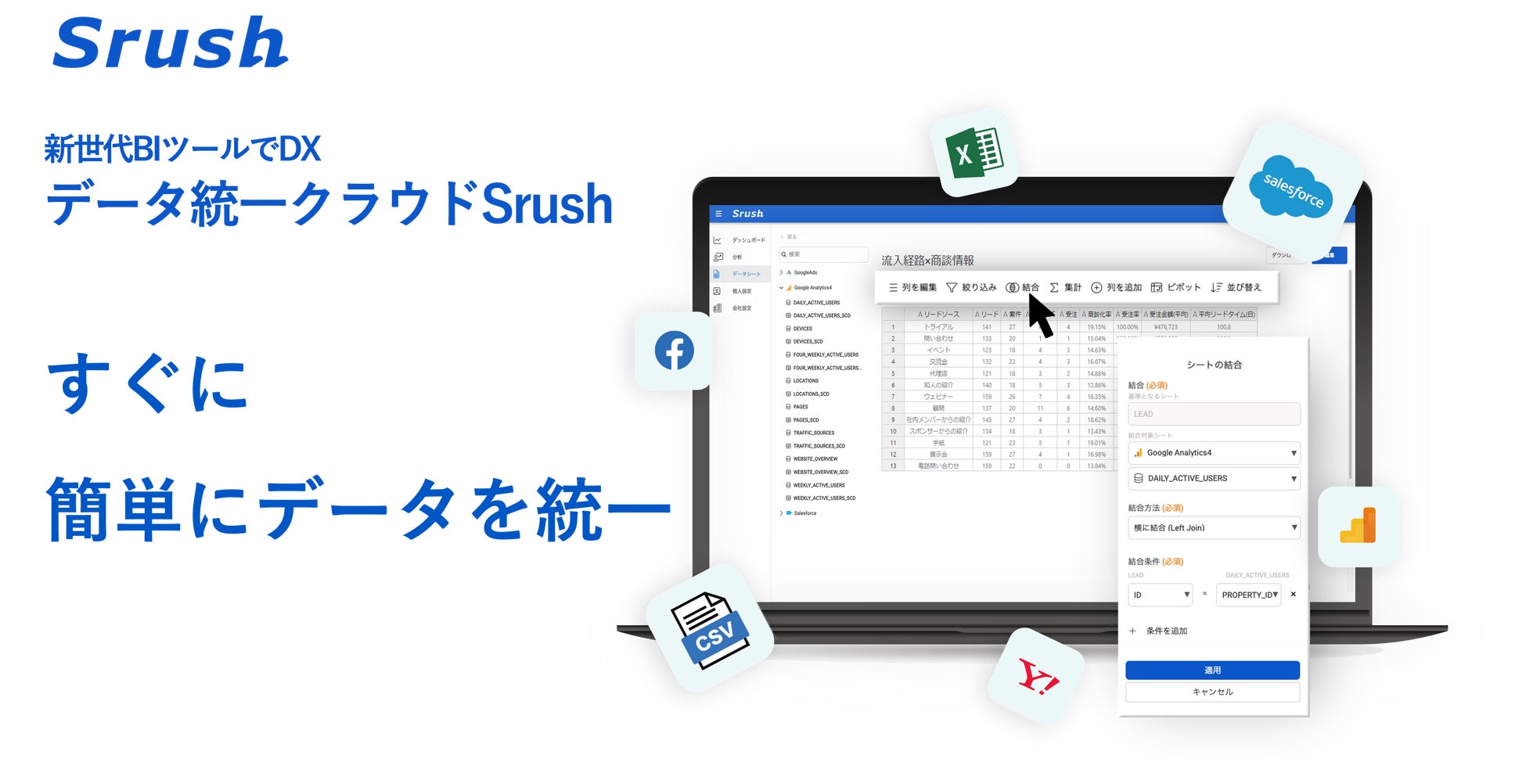 Srushは従来のBIツールと違い、だれでも簡単にデータの統一が可能となり、すぐに分析に着手できる新世代型のBIツールです。