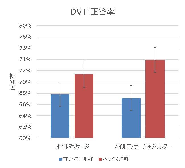 オイルマッサージ⇒シャンプー終了後の認知課題で、コントロール群に比べ、ヘッドキュア群の正答率が統計的に有意に上りました。